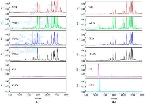 Comparative analysis of the HPLC chemical fingerprints (λ = 280 nm) of the crude organic extracts of Eurotium chevallieri MUT 2316 after 14 days of incubation on six different media (Wickerham’s (WH), WH with salt (WHS), Potato Dextrose Agar (PDA), PDA with salt (PDAS), Gelatin Agar (GA), and GA with salt (GAS)) in (a) pure culture and (b) co-culture. Intensity was fixed at 0.5 AU for all samples.