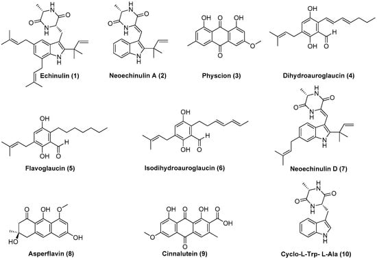 The purification process of the crude organic extracts from the solid and liquid cultures yielded 10 compounds (Figure 5): echinulin (1), neoechinulin A (2), physcion (3), dihydroauroglaucin (4), flavoglaucin (5), isodihydroauroglaucin (6), neoechinulin D (7), asperflavin (8), cinnalutein (9), and cyclo-l-Trp-l-Ala (10).
