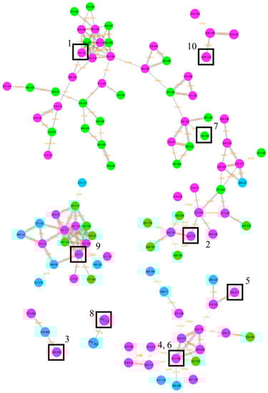 The graphical representation of the molecular network allowed underlining in which condition (solid/liquid) the pure compounds isolated in this study were produced. Figure 6 shows the molecular clusters where the compounds were found; green, blue, and fuchsia nodes indicate compounds found in solid media, liquid media, and in both conditions, respectively. Nine compounds were produced in both solid and liquid culture conditions, while 7 was produced only in the solid medium. Moreover, the presence of different compounds in the same cluster underlined a common biosynthetic pathway; this was the case for 1 and 7, as well as for 4, 5, and 6.