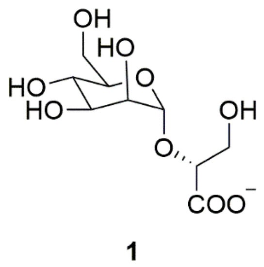 Many hyperthermophiles could release zwitterionic natural products in extreme environments such as high temperature and osmotic pressure to prevent thermal denaturation and aggregation of proteins []. Such natural products may be used to inhibit abnormal α-synuclein aggregation. Mannosylglycerate (MG) (1) is a compatible solute produced by hyperthermophilic bacteria in the hot environment (Figure 1). MG could inhibit the formation of α-synuclein aggregates in a PD yeast model. Moreover, MG could promote the folding of α-synuclein, preventing the pathological aggregation of α-synuclein []. Therefore, MG represents a good candidate for the treatment of PD.
