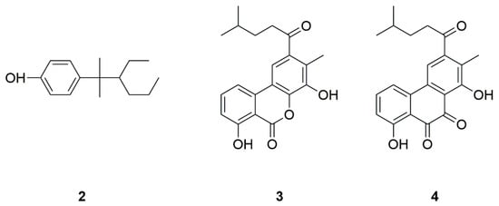 Marine natural products NP7 (2), piloquinone A (3) and piloquinone B (4) derived from bacteria.