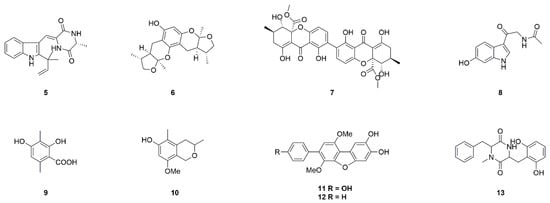 Marine natural products neoechinulin A (5), xyloketal B (6), secalonic acid A (7), 6-hydroxy-N-acetyl-β-oxotryptamine (8), 3-methylorsellinic acid (9) and 8-methoxy-3,5-dimethylisochroman-6-ol (10), candidusin A (11), 4-dehydroxycandidusin A (12) and diketopiperazine mactanamide (13) derived from fungi.