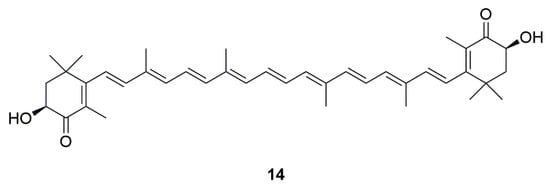 Marine algae are a rich source of antioxidants []. Carotenoids, particularly astaxanthin (14) derived from marine microorganisms (algae such as Haematococcus pluvialis and Chlorella zofingiensis), is proven to be an effective adjuvant therapy for preventing and/or delaying the progression of neurodegenerative diseases (Figure 4) [,]. The unique chemical structure of astaxanthin allowed it to easily cross the blood-brain barrier []. Moreover, astaxanthin could produce anti-PD effects in mice []. It was demonstrated that astaxanthin could reduce the activation of microglia in the brain of mice []. Astaxanthin could also inhibit neuronal apoptosis and mitochondrial abnormalities, and reduce intracellular ROS [,]. In addition, synthetic astaxanthin is superior to algae-extracted astaxanthin in terms of anti-inflammatory and anti-oxidant properties, leading to astaxanthin that is convenient and promising for the treatment of PD [].