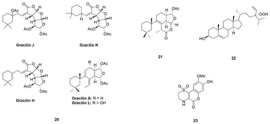 Marine sponges are a rich source of bioactive chemicals [,]. Gracilins (A, H, K, J and L) (20) and tetrahydroaplysulphurin-1 (21) are a group of diterpene derivatives isolated from Spongionella sp., acting on tyrosine kinases (Figure 6) []. Both gracilins and tetrahydroaplysulphurin-1 could protect cortical neurons against oxidative damage by activating the Nrf2/ARE pathway, indicating that these metabolites may be interesting candidates for neurodegenerative diseases [].