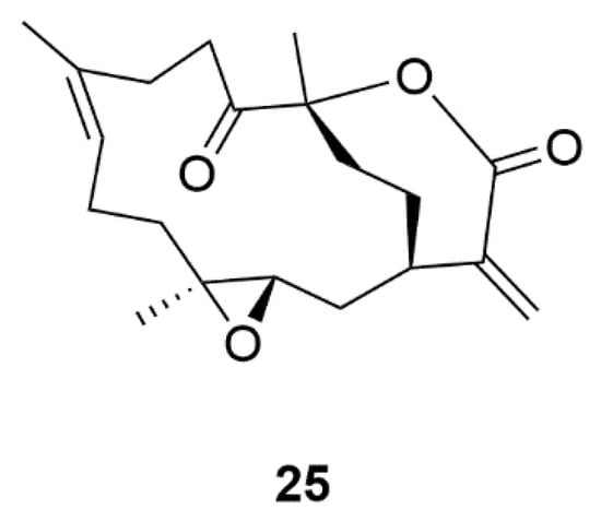 Marine natural product 11-dehydrosinulariolide (25) derived from coral.