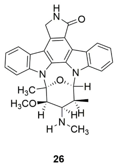 Staurosporine (AM-2282) (26) is a kinase inhibitor originally isolated from the actinomycete Streptomyces staurosporeus (Figure 8) []. Staurosporine (AM-2282) could also be found in marine sea squirt and flatworm []. By activating AMP-activated protein kinase (AMPK)/mammalian target of rapamycin (mTOR) signaling pathway, staurosporine (AM-2282) at 10 nM could induce DA neurite outgrowth in mesencephalic primary cultures []. Moreover, staurosporine (AM-2282) could protect neurons against ischemic-induced toxicity []. However, staurosporine is very toxic. Therefore, staurosporine analogues have been developed from structural modification with the aim of reducing toxicity [].