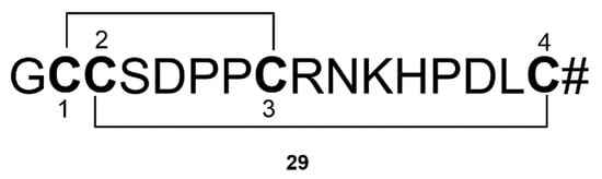 Nicotine acetylcholine receptors (nAChRs) could regulate dopamine release, and are regarded as important target of PD []. Many marine organisms could produce toxins that selectively target nAChRs. α-conotoxin (TxIB) (29) derived from Conus textile is a 16 amino acid peptide (Figure 10). α-conotoxin could block α6/α3β2β3 nAChR with an IC50 value of 28 nM, indicating that α-conotoxin may be a potential candidate against PD [].