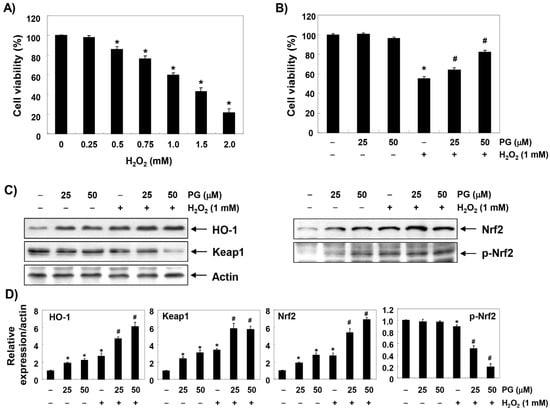 HaCaT cells were treated with various concentrations of H2O2 for 24 h, and the 3-(4,5-dimethylthiazol-2-yl)-2,5-diphenyltetrazolium bromide (MTT) assay was performed to establish the experimental conditions. Figure 1A shows that HaCaT cells treated with H2O2 showed significant decrease in cell viability in a concentration-dependent manner. Therefore, the H2O2 concentration for inducing oxidative stress was selected to be 1 mM, which showed a survival rate of about 60% or less, compared to untreated control cells. To evaluate the protective effect of PG on H2O2-induced cytotoxicity, HaCaT cells were pretreated with 25 and 50 µM PG at concentrations that did not show cytotoxicity for 1 h before treatment with 1 mM H2O2, and cultured for 24 h. Figure 1B shows that the pretreatment with PG significantly restored cell viability in a concentration-dependent manner, compared to H2O2 alone.