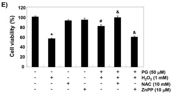 For the cell viability study, HaCaT cells were seeded in 96-well plates at a density of 5 × 103 cells per well. After 24 h incubation, the cells were incubated with PG at 25 and 50 µM or 1 mM H2O2 for another 24 h, or pre-incubated with 25 and 50 µM PG for 1 h, before 1 mM H2O2 treatment for 24 h. The cells were also treated with 10 µM ZnPP (Sigma-Aldrich Chemical Co.), a well-established HO-1 inhibitor, or 10 mM NAC (Sigma-Aldrich Chemical Co.), a ROS scavenger, for 1 h in the presence or absence of H2O2. Subsequently, the medium was removed, and 0.5 mg/ml MTT (Sigma-Aldrich Chemical Co.) was added to each well and incubated at 37 °C for 3 h. The supernatant was then replaced with an equal volume of DMSO, to dissolve the blue formazan crystals for 10 min. Optical density was measured at a wavelength of 540 nm with a microplate reader (Dynatech Laboratories, Chantilly, VA, USA). All experiments were performed in triplicate, and the results were expressed as the percentage of MTT reduction, assuming that the absorbance of control was 100%.