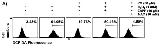 We investigated whether mitigation of the cytotoxic protective effect of PG on H2O2 in the presence of ZnPP was related to the changes in ROS production. Figure 2A,B show that the production of ROS was markedly increased in H2O2-exposed HaCaT cells; however, the accumulation of ROS in the cells pretreated with PG was significantly reduced, compared to H2O2 alone treatment. The effect of preventing ROS formation was reconfirmed using a fluorescence microscope. Consistent with the results from the flow cytometry, the increase in the DCF-DA fluorescence intensity observed in the cells treated with H2O2 was weakened by the pretreatment of PG, as shown in Figure 2C. Furthermore, in order to determine whether PG-induced HO-1 activation was involved in its inhibitory effect of ROS generation, cells were pretreated with ZnPP and PG, and then exposed to H2O2. Figure 2 shows that ZnPP abrogated the protective effect of PG on H2O2-induced ROS production; but the production of ROS was restrained under the condition that NAC was present at the same time.