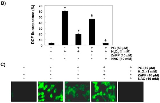 Inhibition of H2O2-induced ROS generation by PG in HaCaT cells. Cells were pretreated with 50 µM PG, 10 µM ZnPP, and/or 10 mM NAC for 1 h, and then treated with 1 mM H2O2 for 1 h. (A) After staining with 2,7′,7-dichlorofluorescein diacetate (DCF-DA) fluorescent dye, DCF fluorescence was monitored by a flow cytometer. (B) The data were shown as mean ± SD obtained from three independent experiments. Statistical significance analysis was carried out using Student’s t-test or ANOVA (* p < 0.05 compared with the control group, # p < 0.05 compared with the H2O2-treated group, & p < 0.05 compared with the PG- and H2O2-treated group). (C) The fluorescent images were obtained by fluorescence microscope (original magnification, ×200). These images are representative of at least three independent experiments.