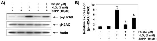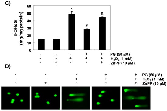 We subsequently performed the following three assays to determine whether PG prevents DNA damage. The immunoblotting results in Figure 3A,B show a marked increase in γH2AX phosphorylation (p-γH2AX, at serine 139), one of the DNA strand break markers, in H2O2-stimulated cells, compared to untreated control cells; however, the increased levels of p-γH2AX by H2O2 were almost suppressed to the control level in the presence of PG. In addition, H2O2 treatment significantly increased the production of 8-hydroxy-2′-deoxyguanosine (8-OHdG) adduct, a specific marker of DNA oxidative damage, compared to the control group, but pretreatment of PG significantly reduced the production of 8-OHdG by H2O2 (Figure 3C). Furthermore, in the comet assay, another method for detecting DNA strand breaks, there was no smeared pattern of nuclear DNA in the untreated control and PG alone treated cells. However, in the H2O2-treated cells, the length of the comet tail clearly increased, which means DNA damage occurred, and in the PG pretreated cells, tail length was obviously shorter than in the H2O2-treated cells (Figure 3D). On the other hand, ZnPP abrogated some, but not all, of the protective effects of PG on the H2O2-induced DNA damages.