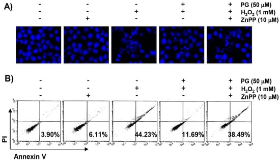 4,6-diamidino-2-phenylindole (DAPI) staining, flow cytometry analysis, and agarose gel electrophoresis were performed, to investigate whether the cytoprotective effect of PG against H2O2 on HaCaT cells was related to apoptosis suppression. The fluorescent images in Figure 4A reveal that the control cells have intact nuclei, while the H2O2-treated cells show significant chromatin condensation, which is observed in the apoptosis-induced cells. However, the morphological changes are markedly attenuated in the cells pretreated with PG before the treatment with H2O2. The results of Annexin V/propidium iodide (PI) double staining also show that the pretreatment of PG significantly decreased the frequency of apoptotic cells in H2O2-stimulated cells (Figure 4B,C). In addition, in the cells treated with PG prior to H2O2 stimulation, the inhibition of colony formation by H2O2 is markedly reduced in a concentration-dependent manner (Figure 4D). Furthermore, H2O2-induced DNA fragmentation is markedly blocked in the presence of PG (Figure 4D).