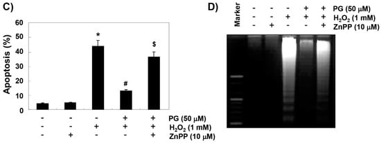 The inhibitory effects of PG against H2O2-induced apoptosis in HaCaT cells. Cells were pretreated with 50 µM PG and/or 10 µM ZnPP for 1 h, and then stimulated with or without 1 mM H2O2 for 24 h. (A) The cells were fixed and stained with 4,6-diamidino-2-phenylindole (DAPI) solution. The stained nuclei are pictured under fluorescence microscope (original magnification, ×400). Representative photographs are shown. (B) The cells were stained with fluorescein isothiocyanate (FITC)-conjugated Annexin V and propidium iodide (PI) for flow cytometry analysis. The percentages of apoptotic cells were determined by counting the percentage of Annexin V-positive cells. (C) Data are expressed as the mean ± SD of three independent experiments. Statistical significance analysis was carried out using Student’s t-test or ANOVA (* p < 0.05 compared with the control group, # p < 0.05 compared with the H2O2-treated group, & p < 0.05 compared with the PG- and H2O2-treated group). (D) DNA fragmentation was analyzed by extracting genomic DNA, electrophoresis in 1.5 % agarose gel, and then visualizing by ethidium bromide (EtBr) staining.