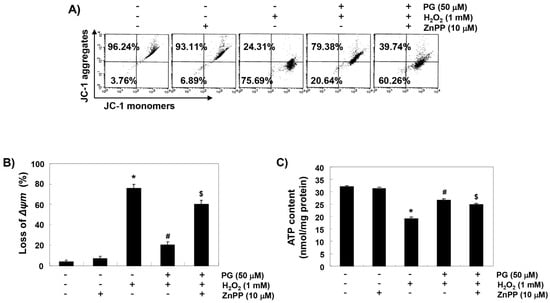 To examine the protective effect of PG on mitochondrial dysfunction by H2O2, mitochondrial membrane potential (MMP) and intracellular ATP levels were evaluated. According to the results of 5,5′6,6′-tetrachloro-1,1′,3,3′-tetraethyl-imidacarbocyanine iodide (JC-1) staining shown in Figure 5A,B, changes in the ratio of polarized and depolarized cell populations were observed in HaCaT cells treated with H2O2. Along with the results, the concentration of ATP in cells exposed to H2O2 was significantly decreased, compared with cells cultured in normal medium (Figure 5C). However, PG was able to prevent these changes, and the protective effects of PG were significantly abrogated in the presence of ZnPP.