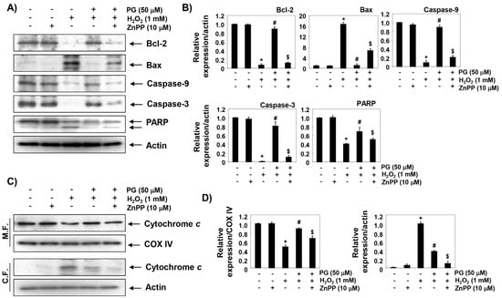 To further investigate the mechanisms of the anti-apoptotic effect of PG and the role of HO-1, we examined the effects of PG and ZnPP on the H2O2-induced changes of expression of apoptosis regulatory genes. The immunoblotting results of Figure 6A,B show that anti-apoptotic Bcl-2 protein was significantly down-regulated in H2O2-treated HaCaT cells, while the pro-apoptotic Bax protein was up-regulated. Additionally, the expression of pro-caspase-9 and -3 was markedly reduced in H2O2-treated cells as compared with the control, and the expression of cleaved poly (ADP-ribose) polymerase (PARP), a representative substrate protein degraded by activated caspase-3, was also increased. Furthermore, the expression of cytochrome c in H2O2-stimulated cells increased in the cytoplasmic fraction, compared to the mitochondrial fraction, indicating that cytochrome c was released from the mitochondria into the cytoplasm (Figure 6C,D). However, these changes by H2O2 treatment were relatively conservative in the PG-pretreated cells, and the protective potentials of PG disappeared under the condition in which the activation of HO-1 was suppressed.