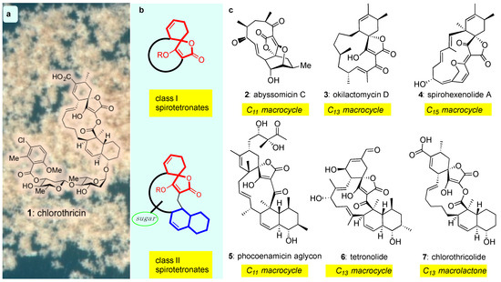 The discovery of chlorothricin (1) in 1969 [38] defined a new class of bacterial metabolites that possess an architecturally intriguing structure and promising chemotherapeutic properties as antitumor antibiotics. Referred to as spirotetronates, these compounds are commonly produced by both marine and terrestrial actinomyces and are structurally identified by the presence of a tetronic acid spiro-linked to a cyclohexene (or a cyclohexane) ring (Figure 1b, red motif). Spirotetronates can be further divided into two sub-classes: class I, which contain the spirotetronate motif integrated within a macrocycle and class II, which also contain an integrated decalin (Figure 1b, blue motif) and frequently, oligosaccharide chains attached to the decalin and/or the macrocycle (Figure 1b, green circle) [39,40]. Beyond these general requirements, the structures of class I and II are highly variable (Figure 1).