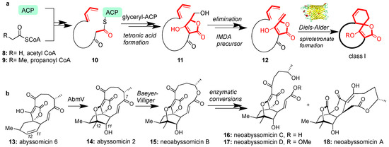 (a) Generic biosynthetic pathway for class I spirotetronates; (b) Enzymatic conversion and postulated biosynthetic relationship of various abyssomicins.