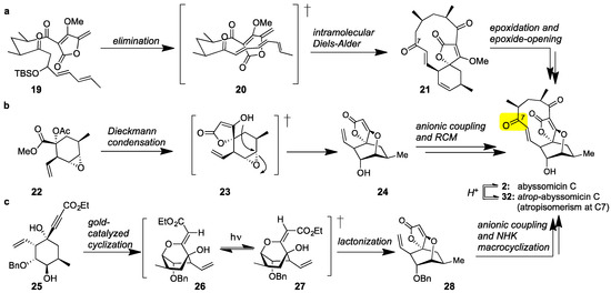(a) The Sorensen bioinspired synthesis of abyssomicin C (2) featuring an IMDA reaction; (b) The Nicolaou atroposelective synthesis of abyssomicin C and atrop-abyssomicin C (32, Figure 5) featuring a ring-closing metathesis (RCM); (c) The Saicic synthesis of atrop-abyssomicin C featuring a Nozaki-Hiyama-Kishi (NHK) macrocyclization.