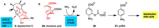Abyssomicin C (2) was found to be the first structure-based inhibitor of amino deoxychorismate synthase (ADCS), an enzyme essential for the conversion of chorismic acid (29) to p-aminobenzoic acid (pABA, 31). Since the pABA pathway is exclusive to bacteria and essential to their survival, it represents an attractive target for antibacterial drug design [68,69]. Acting as a structural mimic of 29 (see common red motif, Figure 4), abyssomicin C binds at the chorismate active site of ADCS where it irreversibly reacts with a proximal cysteine via conjugate addition at the C9 center (Michael-acceptor) [70]. Unfortunately, this type of conjugate addition reaction is not very selective leading to off-target complications [71].