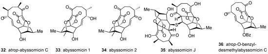 Abyssomicin 2 (34) was discovered as part of a natural products screening campaign to identify HIV-1 reactivators [45]. It was found that 34 reactivates HIV-1 at 56% at an EC50 of 13.9 µM. The mechanism of action of abyssomicin 2 is novel and remains to be elucidated. While conducting this study, the researchers also proposed a structural correction to abyssomicin 1 (33), showing it to be almost enantiomeric to the originally proposed structure, with the exception of the alcohol assignment [45]. The retroviral induction potential of abyssomicin 2 (34) demonstrates the family’s broad application as drug leads, not limited to antitumor antibiotics.