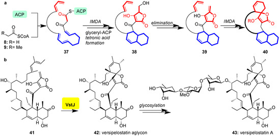 (a) General biosynthesis of class II spirotetronates; (b) VstJ-catalyzed intramolecular Diels-Alder reaction of 41 to 42 en route to versipelostatin A (43).
