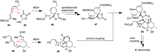 Roush and Yoshii groups’ approaches to tetronolide (6), featuring IMDA reactions for the construction of both the spirotetronate and the decalin motifs and a Julia coupling to ultimately close the macrocycle (P = various protecting groups).