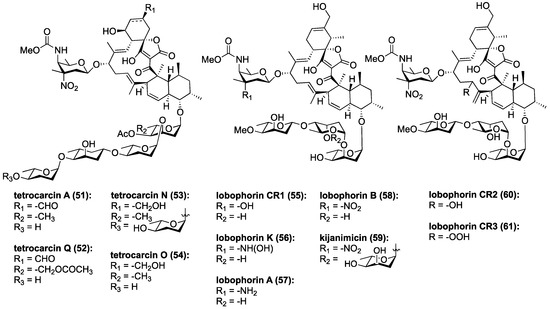 Recently three new marine tetrocarcins were discovered. Tetrocarcins N (53) and O (54) were isolated from Micromonospora sp. 5-297 using a PCR-based screen that targets glycosidic antibiotics [100]. They exhibited antibacterial activity against B. subtilis. Compound 53 was substantially more potent than 54 suggesting that extended oligosaccharide chains enhance the biological activity. Both 53 and 54 were less active than tetrocarcin A (51), suggesting that the formyl group at the spirotetronate motif is biologically important [100]. The most recent tetrocarcin to be discovered is tetrocarcin Q (52), which was isolated from Micromonospora carbonacea LS276 and contains an unusual acetoxy unit on its oligosaccharide motif [101].