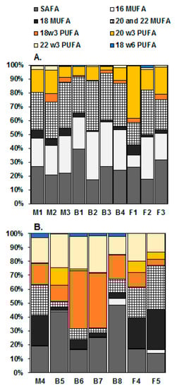 - Taipale, S.; Strandberg, U.; Peltomaa, E.; Galloway, A.W.E.; Ojala, A.; Brett, M.T. Fatty acid composition as biomarkers of freshwater microalgae: Analysis of 37 strains of microalgae in 22 genera and in 7 classes. Aquat. Microb. Ecol. 2013, 71, 165–178. [Google Scholar] [CrossRef]