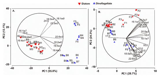 2.2. Phylogeny and Habitat Explaining the Proportional Fatty Acid Profiles and Contents of Diatoms and Dinoflagellates