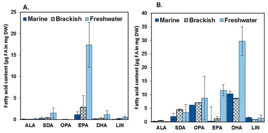 | Taxa | Habitat | Total FA (µg FA mg DW−1) | ω-3 (µg FA mg DW−1) | ALA (µg FA mg DW−1) | SDA (µg FA mg DW−1) | OPA (µg FA mg DW−1) | EPA (µg FA mg DW−1) | DHA (µg FA mg DW−1) | ω-6 (µg FA mg DW−1) | LA (µg FA mg DW−1) | GLA (µg FA mg DW−1) | ARA (µg FA mg DW−1) | DPA (µg FA mg DW−1) | ω-6:3 -ratio |