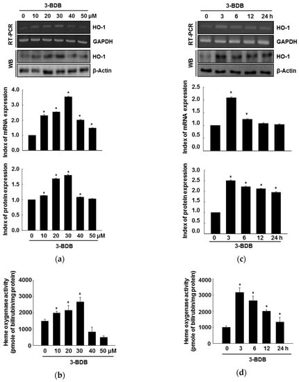 Cells (1 × 105 cells/mL) were cultured in 100-mm dishes. After 16 h, the cells were treated with 3-BDB (10 µM, 20 µM, 30 µM, 40 µM, or 50 µM). At predetermined time points, total RNA was isolated with TRIzol® reagent (GibcoBRL, Grand Island, NY, USA). The PCR program for HO-1 and the housekeeping gene glyceraldehyde 3-phosphate dehydrogenase (GAPDH) was as follows: 35 cycles of 94 °C for 45 s, 53 °C for 45 s, and 72 °C for 60 s. The primer pairs (Bionics, Seoul, Republic of Korea) were as follows (forward and reverse, respectively): HO-1, 5′-GAGAATGCTGAGTTCATG-3′ and 5′-ATGTTGAGCAGGAAGGC-3′; GAPDH, 5′-GTGGGCCGCCCTAGGCACCAGG-3′ and 5′-GGAGGAAGAGGATGCGGCAGTG-3′. The amplified products were resolved on 1% agarose gels, stained with ethidium bromide, and photographed under UV light [19].