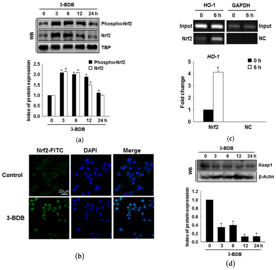 Effect of 3-BDB (30 µM) on the protein expression, nuclear translocation, and Nrf2 binding to antioxidant response element. (a) The expressions of phospho-Nrf2 and Nrf2 were detected by Western blotting of nuclear extracts. (b) Cells with Nrf2 are shown in green; the nuclei are shown in blue. Merged images show the nuclear translocation of Nrf2. Green represented Nrf2-fluorescein isothiocyanate (FITC) stained cells and blue represented 4′,6-diamidino-2-phenylindole (DAPI) stained nucleus. (c) Binding of Nrf2 to the ARE sequence in the HO-1 promoter was analyzed via chromatin immunoprecipitation (ChIP) followed by PCR. NC: negative control. (d) Keap1 expression was analyzed via Western blotting. * Significant difference compared to the control (p < 0.05).