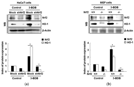 Role of Nrf2 in the 3-BDB (30 µM)-mediated enhancement of Nrf2 and HO-1 expression. (a) HaCaT cells were transfected with shRNA-control and shRNA-Nrf2 plasmids and treated with 3-BDB. Western blotting was used to analyze the proteins in the whole cell lysates. (b) Nrf2-WT or Nrf2-deficient mouse embryonic fibroblast (MEF) cells were treated 3-BDB, and Western blotting was used to measure the levels of HO-1 and Nrf2. * Significant difference compared with control (p < 0.05); ** significant difference compared with 3-BDB-treated cells (p < 0.05).