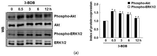 Cells were seeded in 60-mm culture dishes. After 16 h, the cells were cocultured with 3-BDB (30 µM). The cells were then harvested at the indicated time points. After washing with phosphate-buffered saline (PBS) twice, the cells were lysed by incubating in lysis buffer for 30 min. After centrifuging, the lysate was used to detect protein levels. The proteins were separated via SDS-PAGE in a 10% resolving gel. The separated proteins were transferred to nitrocellulose membranes (Bio-Rad, Hercules, CA, USA). Then, the membranes were incubated with primary and then secondary antibodies (Pierce, Rockland, IL, USA). Images of Western blots were obtained on a LAS-3000 (Fujifilm, Tokyo, Japan) using an enhanced chemiluminescence Western blotting detection kit (Amersham, Little Chalfont, Buckinghamshire, UK) [36].
