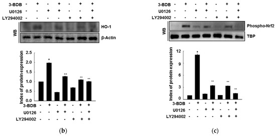 Treatment with 3-BDB (30 µM) significantly enhanced the phosphorylation of ERK and Akt in a time-dependent manner within 30 min of treatment (Figure 4a). To further examine whether ERK and Akt activation are caused by the cytoprotective effects of 3-BDB, cells were pretreated with U0126 and LY294002 (ERK inhibitor and Akt inhibitor, respectively) one hour before treatment with 3-BDB. U0126 and LY294002 notably attenuated HO-1 expression and Nrf2 phosphorylation upon 3-BDB treatment (Figure 4b,c). These results suggest that the protective effect of 3-BDB is mediated by ERK and Akt signaling, an important upstream signaling pathway that regulates Nrf2/HO-1.