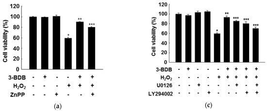 To determine whether the cytoprotective effect of 3-BDB is related to the upregulation of HO-1 activity, HaCaT cells were pretreated with zinc protoporphyrin (ZnPP), a HO-1 inhibitor. ZnPP markedly inhibited the protective effect of 3-BDB against H2O2- or UVB-induced cytotoxicity, suggesting that HO-1 induction is responsible for the enhancement of cell viability in 3-BDB-pretreated cells under oxidative stress (Figure 5a,b). Thus, the cytoprotection by 3-BDB probably involves HO-1.