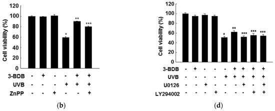 Cytoprotective effect of 3-BDB (30 µM) against cellular oxidative stress. HaCaT cells were pretreated with zinc protoporphyrin (ZnPP), along with 3-BDB, and exposed to (a) H2O2 or (b) UVB radiation. Cells were pretreated with U0126 or LY294002 and/or 3-BDB and exposed to (c) H2O2 or (d) UVB radiation. Cell viability was analyzed after 24 h by the 3-(4,5-dimethylthiazol-2-yl)-2,5-diphenyltetrazolium bromide (MTT) assay. * Significant difference compared with control (p < 0.05); ** significant difference compared with H2O2- or UVB-treated cells (p < 0.05); *** significant difference compared with 3-BDB + H2O2- or 3-BDB + UVB -treated cells (p < 0.05).