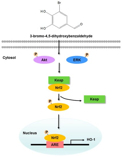 The natural antioxidant compound 3-bromo-4,5-dihydroxybenzaldehyde (3-BDB) has been isolated from marine red algae such as Rhodomela confervoides, Polysiphonia morrowii, and Polysiphonia urceolata [20,21,22]. The 3-BDB compound exerts radical scavenging and antiviral effects against different types of viruses such as infectious pancreatic necrosis virus and fish pathogenic infectious hematopoietic necrosis virus [21,22], while also exerting photoprotective effects on human keratinocytes that are exposed to ultraviolet B-mediated oxidative stress [23]. However, the mechanisms underlying the cytoprotective effects of 3-BDB against oxidative stress are unclear.