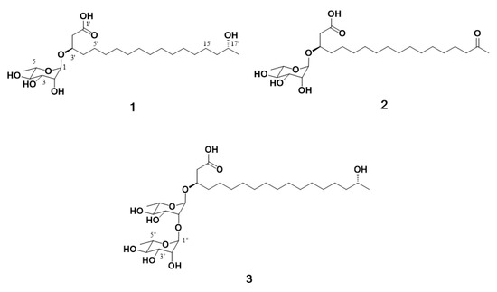 The marine environment constitutes a significant reservoir of natural products which has offered the potential for new drug development over the last few decades [13]. Specifically, marine microorganisms are considered efficient producers of lead compounds with biomedical potential [14]. In addition, structurally diverse and impressive bioactive natural products have been identified from marine microbes [15]. In our continuous search for secondary metabolites from marine-derived bacteria, the Actinoalloteichus hymeniacidonis strain 179DD−027 was isolated from a deep-sea sediment sample collected off the coasts of Dokdo Island, East Sea, Republic of Korea. Dokdo Island is a large volcanic island with 89 small islets and rocks containing rich and well-preserved biodiversity [16]. Subsequent fermentation of the producing strain, solvent extraction and chemical investigation procedures led to the isolation of three new rhamnolipids, named dokdolipids A−C (1−3) (Figure 1). Dokdolipids represent the first rhamnolipids containing a hydroxyl (1 and 3) group and a ketone group (2) in the side chains. In this paper, we describe the isolation, structure elucidation and bioactivities of dokdolipids A−C (1−3).