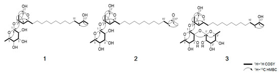 The following are available online at https://www.mdpi.com/1660-3397/17/4/237/s1, Figures S1–S10: HRESI-MS data, 1H NMR, 13C NMR, COSY, HSQC, HMBC, ROESY and experimental spectra of 1; Figures S11–S26: HRESI-MS data, 1H NMR, 13C NMR, COSY, HSQC, HMBC and experimental spectra of 2 and 3.