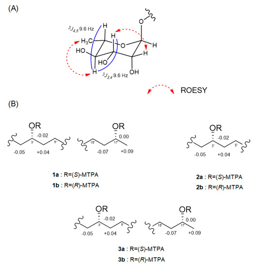 (A) ROESY correlations in the sugar moiety of 1. (B) ΔδS−R values in ppm of the MTPA esters of the methylated aglycones of 1–3.