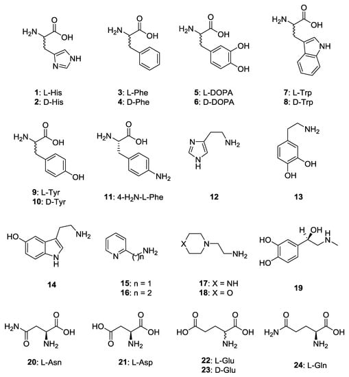 We report the activation profiles of PhaCA and CpsCA with a wide range of amino acid and amine activators of types 1–24 (Figure 1), which were obtained by measuring the dose response curves of the activation of the two enzymes in the presence of increasing concentrations of activators. It should be mentioned that in order to act as CAAs, the amino and COOH moiety of the inhibitor should generally not be derivatized []. Small modifications such as N-methylation or the transformation of the COOH to COOMe groups are tolerated and do not significantly change the CA activating properties, as demonstrated earlier by us [,,]. This is the reason why we include amines and amino acids 1–24 in our study and not some of their derivatives. In this way, the KA values of the 24 compounds were determined for the two enzymes (see Materials and Methods for details). We included in our study the amino acids and amines that were investigated as activators of CAs belonging to various classes of enzymes present in diverse organisms, both eukaryotic and prokaryotic [,,,,,,,,].