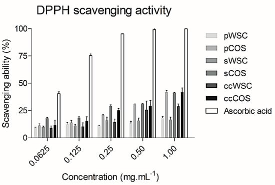 pCOS, sCOS, and ccCOS showed the highest scavenging activity. The WSC products showed a lower activity than COS at all concentrations tested (Figure 1). Also, no differences were noted between products obtained from P. henslowii and the commercial product. However, compared to the scavenging ability of ascorbic acid, all products had lower values.