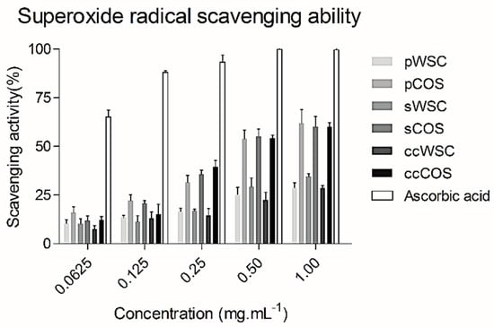 The superoxide scavenging ability of all water-soluble chitosan (WSC) and chitooligosaccharide (COS) samples was assessed by the method of Reference [71]. This assay was based on the reduction of nitro blue tetrazolium (NBT) in the presence of NADH and phenazine methosulphate (PMS) under aerobic condition. The 3.00 mL reaction mixture contained 50 µL of lM NBT, 150 µL of l M nicotinamide adenine dinucleotide (NADH), and Trisbuffer (0.02 M, pH 8.0). The samples were added with concentrations ranging from 0.0625 to 1.0 mg·mL−1. The reaction started by adding 15 µL of lM phenazine methosulfate (PMS). After incubation at room temperature for 5 min, 300 µL of each reaction were transferred to a 96-well plate, and the absorbance was recorded at 560 nm against a blank in microplate reader (Biotek, Vermont, USA). EDTA was used as a positive control. The capability of scavenging to superoxide radical was calculated using the following Equation (2):