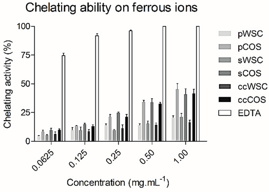 In general, the chelation ability of all WSCs with concentrations ranging from 0.0625 to 1 mg·mL−1 was relatively low. On the contrary, EDTA exhibited an excellent ferrous ion-chelating capacity of approximately 74.6 ± 4.1% at a concentration of 0.0625 mg·mL−1. Nevertheless, all products proved a high chelation ability within 1 mg·mL−1, showing COSs the highest activities, from 40.7 ± 10.1% (sCOS) to 45.2 ± 10% (pCOS). When tested at 0.5 and 1 mg·mL−1, COSs almost presented a two-times-higher chelating power than WCSs. Also, no differences were seen between sCOS, pCOS, and ccCOS. Still, EDTA proved to be much more potent at 1 mg·mL−1, chelating all ferrous ions (100%). Other authors [51] reported similar activities for EDTA when compared to the N-alkylated disaccharide chitosan derivative. Despite the close relation of the chitosan metal ion absorption capability to its amino acid content and their distribution, other factors such as affinity for water, pH, temperature, and crystallinity also affected the ion-chelating activity [52,53].