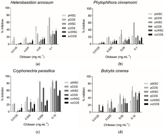 The molecular weight of chitosan is known to influence its ability to inhibit the activity of several fungal species [55]. The antifungal activity of WSC and COS products towards the plant pathogens B. cinerea, H. annosum, P. cinnamomi, and C. parasitica is shown in Figure 4. The concentrations of chitosan ranged from 0.0125 to 0.1 mg·mL−1. The antifungal activity of all chitosan products proved to be dose-dependent, but despite the observed inhibitory effect, none of the tested fungal species were completely inhibited by COS or WSC at the highest concentrations. However, pCOS and sCOS showed a good inhibition against Cryphonectria parasitica. Overall, pCOS exhibited a higher activity against all other tested species than sCOS, pWSC, and sWSC.