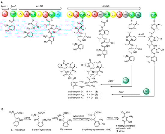 - Pfennig, F.; Schauwecker, F.; Keller, U. Molecular characterization of the genes of actinomycin synthetase I and of a 4-methyl-3-hydroxyanthranilic acid carrier protein involved in the assembly of the acylpeptide chain of actinomycin in Streptomyces. J. Biol. Chem. 1999, 274, 12508–12516. [Google Scholar] [CrossRef]