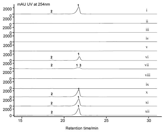 HPLC analysis of S. costaricanus strains fermentation extracts. (i) WT producer; (ii) ∆acnDE mutant; (iii) ∆acnN1 mutant; (iv) ∆acnN3 mutant; (v) ∆acnGHLM mutant; (vi) ∆acnW mutant; (vii) ∆acnU4 mutant; (viii) ∆acnR mutant; (ix) ∆acnO mutant; (x) ∆acnT1 mutant; (xi) ∆acnT2 mutant; (xii) ∆acnT3 mutant. 1, actinomycin D; 2, actinomycin Xoβ.; 3, actinomycin X2.