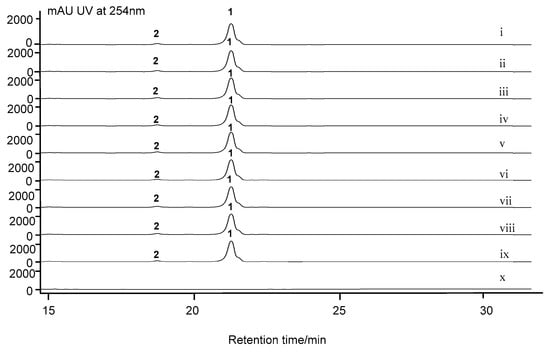 HPLC analyses of S. costaricanus strains fermentation extracts. (i) WT producer; (ii) ∆acnA mutant; (iii) ∆acnB mutant; (iv) ∆acnC mutant; (v) ∆acnU1 mutant; (vi) ∆acnU2 mutant; (vii) ∆acnU3 mutant; (viii) ∆phs mutant; (ix) ∆acnQ mutant; (x) ∆acnF mutant. 1, actinomycin D; 2, actinomycin Xoβ.